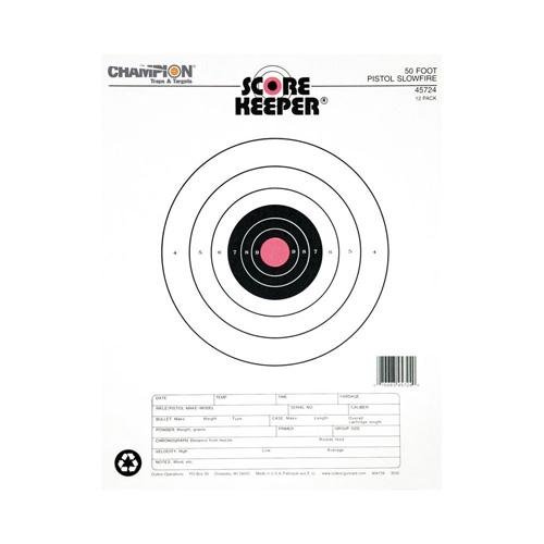 Champion Score Keeper Fluorescent Orange paper targets make it easy to see your shot placement and record ammunition data in one place. The bright orange fluorescent bullseye creates a contrast between the bullseye and the rest of the target and a “built-in” record-keeping section lets you track vital data to refine your loads and zero-in on tight groups. Available for rifles pistols and airguns.