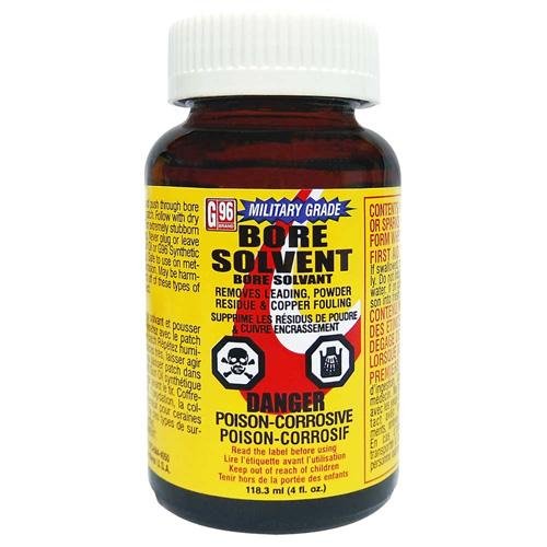 Military Grade Bore Solvent. Removes Leading Powder Residue and Copper Fouling from Bore of firearm. Safe to use on metals. Will not cause rust oxidation staining or galvanic corrosion. May be harmful to some paints varnishes and plastics. Keep product OFF of these types of surfaces unless a previous patch test has shown no effect. It is recommended that the firearm be re-treated with G96 Gun Treatment G96 Gun Oil or G96 Synthetic CLP Gun Oil after use.Description: