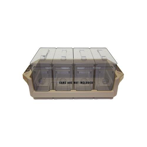Designed for the easy transportation and storage of the hundreds of millions of US Metal Military 30 Caliber ammo cans out there. Excellent for organizing ammo tactical gear tools survival gear and easy to secure with Four tie down spots for ATV attachment. Trays are stackable and nest on to the top of each ammo can giving you the ability to stack them tall. Metal ammo cans have a tendency to rust when stored on certain floor types the tray holds them 3/8″ off the floor. Ammo cans sold separately. MAC30 hold 4 30 Cal. Metal ammo cans securely in their slots and each tray will hold up to 100 lbs. Strong large handles carry the load easily and the tray are made of rugged polypropylene to last. Both sizes of the Metal Ammo Can Trays stack on top of each other. Made in the USA!