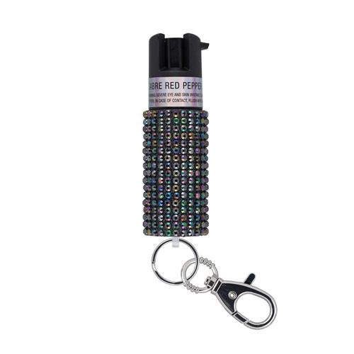 Upgrade your style while staying safe with easy access to protection with the SABRE Jeweled Pepper Spray with Snap Clip and Snap Clip. The canister contains 25 bursts (5x the competition) for protection against multiple threats from a safe distance. With an industry-exclusive HPLC laboratory only SABRE guarantees its maximum strength formulation in every canister to help give you peace of mind certainty reliability and safety when you need it most. The twist lock safety prevents an accidental discharge from occurring in your purse or bag. Snap Clip allows for quick and secure attachment onto keys and bags for easy access to your protection when you need it most. Show off your style with the sparkly jeweled monochromatic design in black silver or lavender. SABRE Pepper Spray is made in USA.