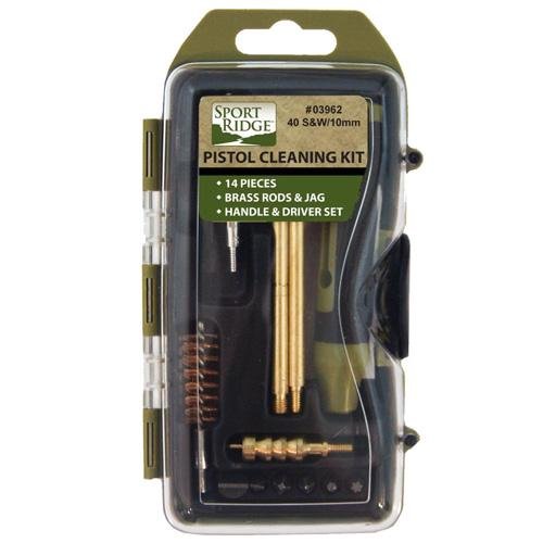These custom cased pistol cleaning kits are designed for cleaning a variety of pistols. The custom case fits well in a pack or range bag. Includes two brass rods one pistol brush one pistol mop one slot tip one pistol brass jag 25 cleaning patches one multi-function handle which converts to a driver and a six-piece utility bit set with two flat blades two phillips one star and one hex bit.